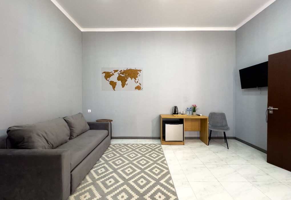 Площадь номера - 40 кв.м. 2 комнаты. 2 осн. места. (1 и 2 этаж), номер с террасой на 1 этаже. В номере: телевизор; балкон; кондиционер; спутниковое телевидение; душ; туалет; фен; электрочайник; сейф; халаты; тапочки; Wi-Fi; туалетные принадлежности; 1-спальные/ 2-спальная кровать; мини-холодильник. 2 доп. места: