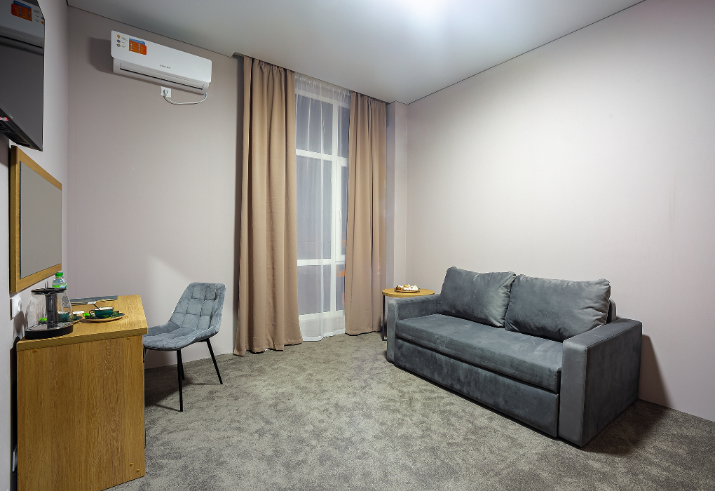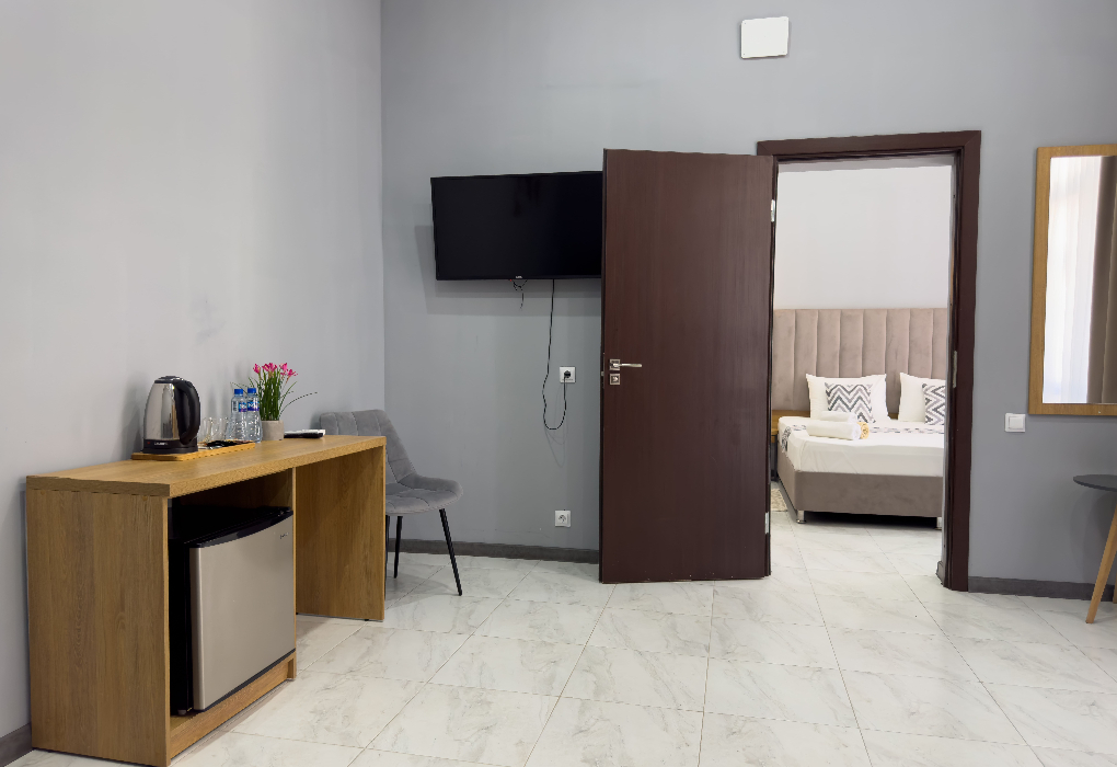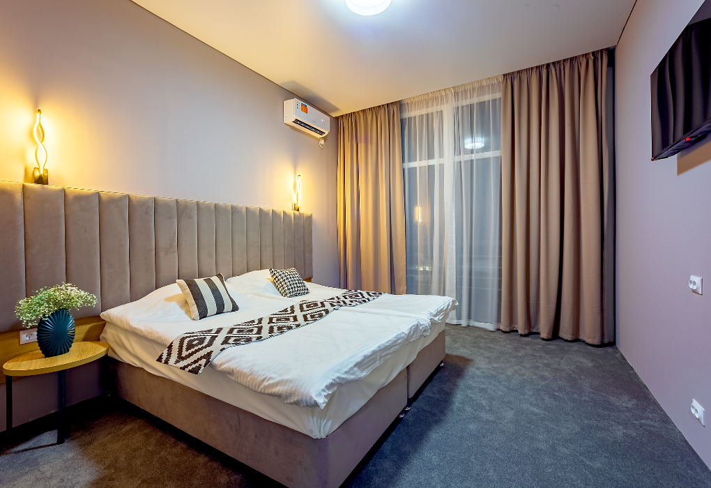 Площадь номера - 40 кв.м. 2 комнаты. 2 осн. места. (1 и 2 этаж), номер с террасой на 1 этаже. В номере: телевизор; балкон; кондиционер; спутниковое телевидение; душ; туалет; фен; электрочайник; сейф; халаты; тапочки; Wi-Fi; туалетные принадлежности; 1-спальные/ 2-спальная кровать; мини-холодильник. 2 доп. места: