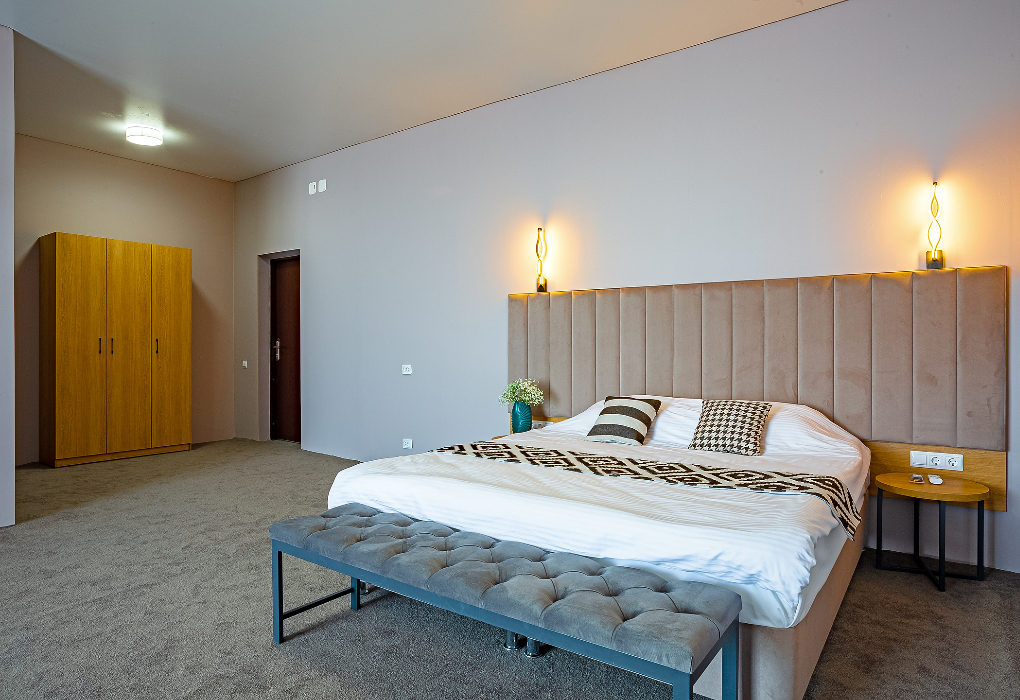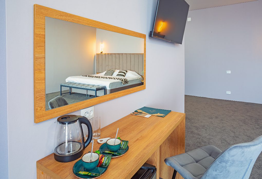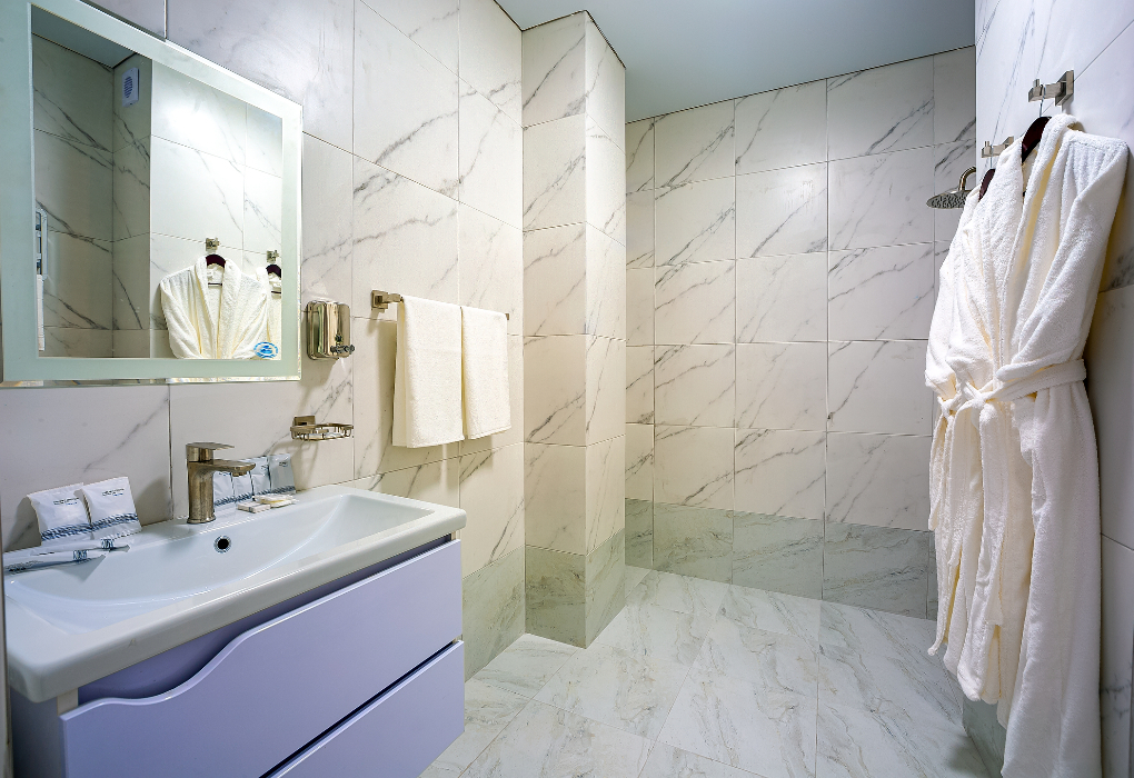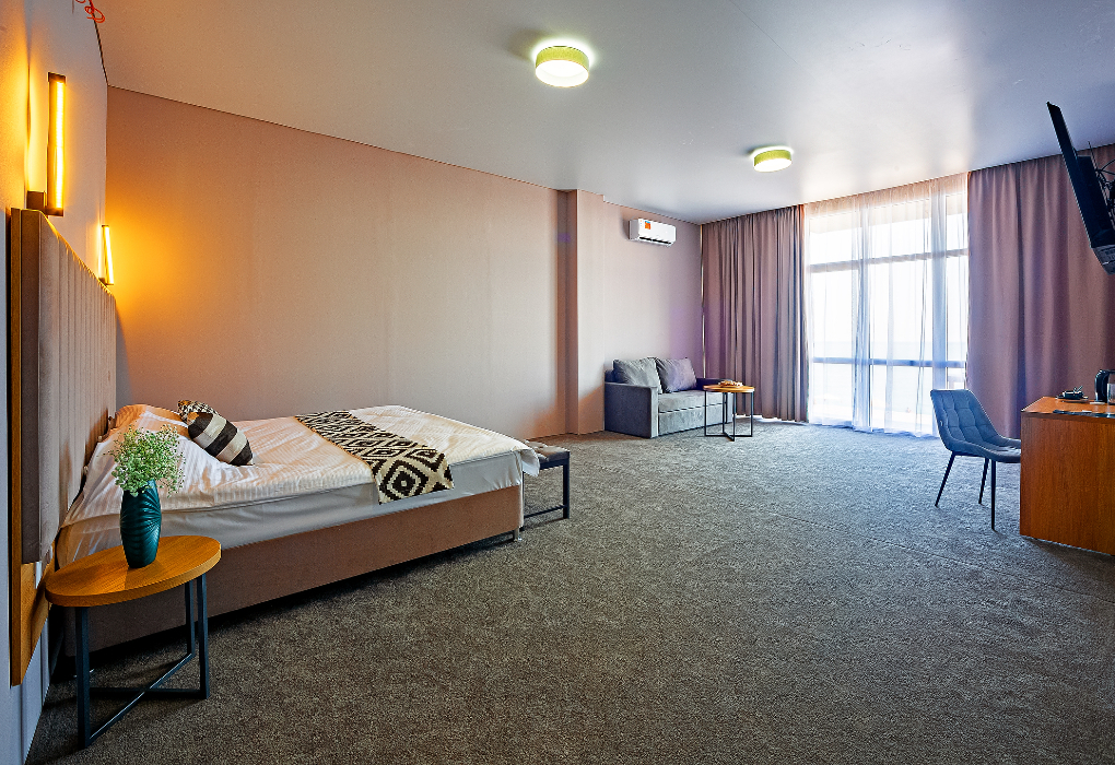 Площадь номера - 34-53 кв.м. 1 комната. 2 осн. места. обеденная группа (стол и 4 стула). В номере: телевизор; холодильник; балкон; кондиционер; спутниковое телевидение; душ; туалет; фен; электрочайник; сейф; халаты; тапочки; Wi-Fi; туалетные принадлежности; 1-спальные/ 2-спальная кровать; кресло-кровать; диван-кровать. 3 доп. места:
