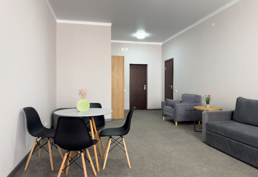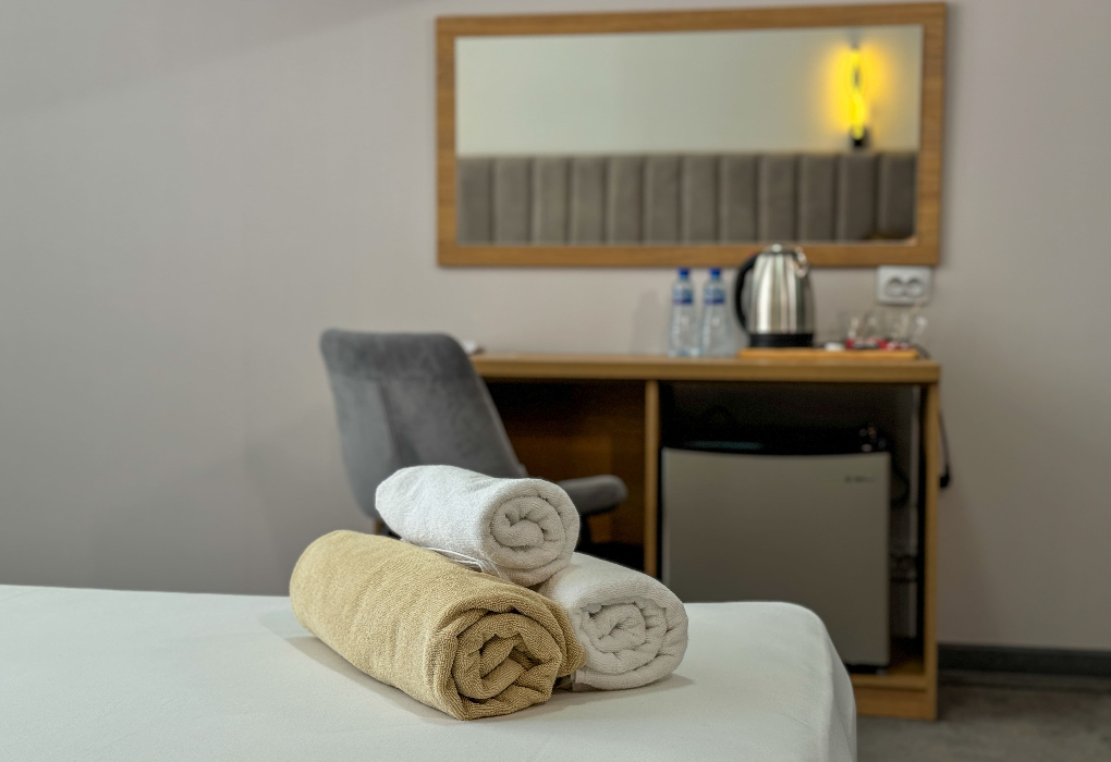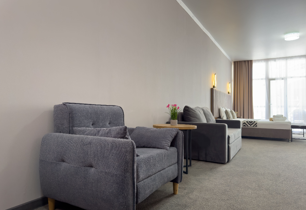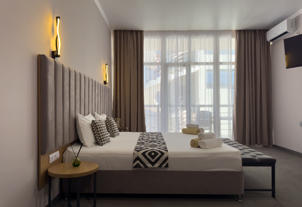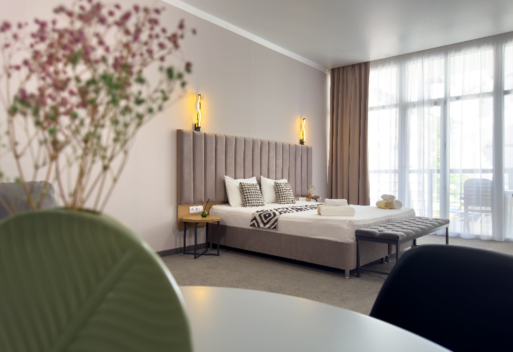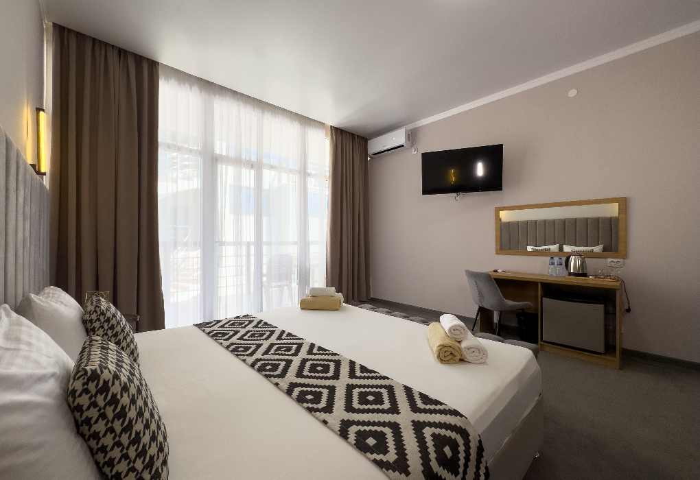 Площадь номера - 50 кв.м. 1 комната. 2 осн. места. обеденная группа (стол и 4 стула). В номере: телевизор; балкон; кондиционер; спутниковое телевидение; душ; туалет; фен; электрочайник; сейф; халаты; тапочки; Wi-Fi; туалетные принадлежности; 1-спальные/ 2-спальная кровать; кресло-кровать; мини-холодильник; диван-кровать. 4 доп. места: