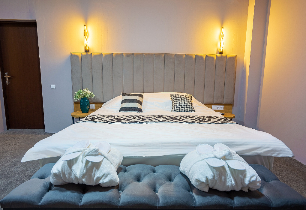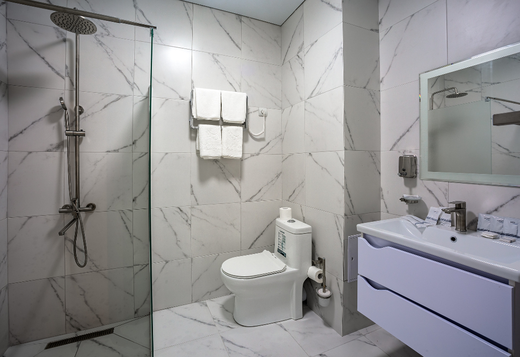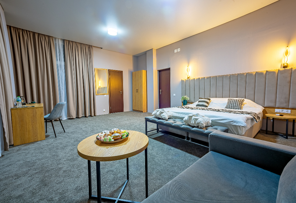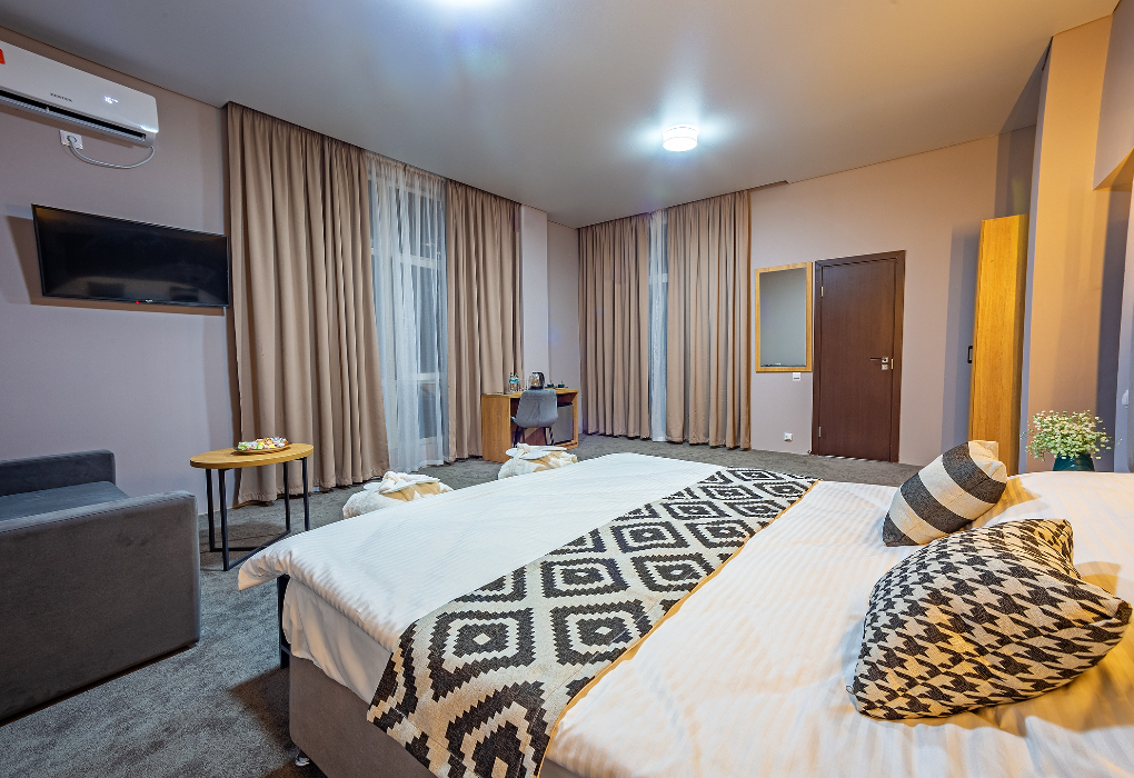 Площадь номера - 36-48 кв.м. 1 комната. 2 осн. места. (1-2 этаж), номер с террасой на 1 этаже. В номере: телевизор; балкон; кондиционер; спутниковое телевидение; душ; туалет; фен; электрочайник; сейф; халаты; тапочки; Wi-Fi; туалетные принадлежности; 1-спальные/ 2-спальная кровать; мини-холодильник. 2 доп. места: